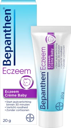 Bepanthen Eczeem Creme is er ook voor de allerkleinsten (te gebruiken vanaf de geboorte) en verkrijgbaar in een kleine variant van 20 gram in het babyschap en online. Bepanthen Eczeem Creme bevat geen cortisonen (hormonen) en parfum. Bepanthen Eczeem Creme verlicht effectief jeuk en roodheid bij licht tot matig atopisch eczeem op de babyhuid. Daarnaast ondersteunt de baby creme het huidherstel* bij huidirritatie, zoals eczeem (atopisch) of een allergische reactie op de babyhuid.
