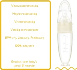 De fles bestaat uit zeer zacht siliconen materiaal, hierdoor kan je er moeiteloos in knijpen en gemakkelijk de hoeveelheid voedsel op het lepeltje doseren.Op deze manier krijgt je baby’tje nooit teveel voedsel binnen. En dat allemaal zonder te knoeien! Het lepeltje aan de fles bestaat ook uit zacht siliconen, zo kan het mondje van de baby niet beschadigd raken en is de fles helemaal veilig te gebruiken voor je baby. Feit: Deze fles is 100% babysafe!