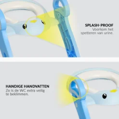 De kinderen toilet trap is makkelijk schoon te maken met een warm sopje en een doek. Hierdoor kun je het product zo snel mogelijk weer neerzetten voor de volgende keer dat je kind er gebruikt van moet maken. Ook hoef je je geen zorgen te maken dat je kind per ongeluk het toilet mist tijdens het plassen omdat het een anti-splash stukje heeft aan de voorkant van het zitje.