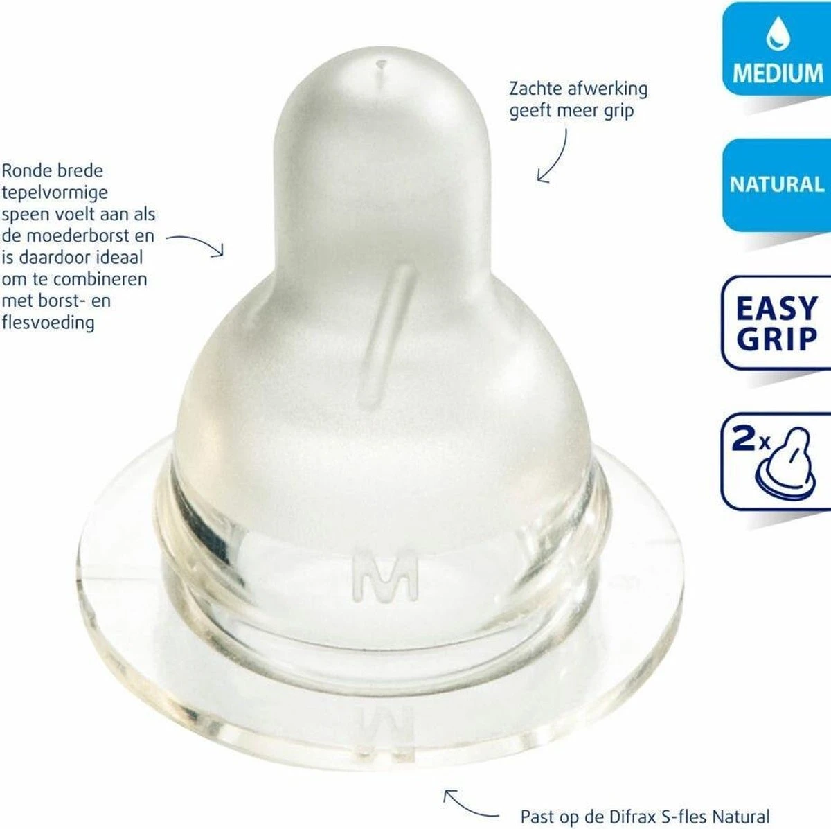 Medium: vanaf 3 maanden of als small te langzaam gaat. Geschikt voor dunne en dikke voeding zoals melkvoeding (borstvoeding of met melkpoeder) en pap.