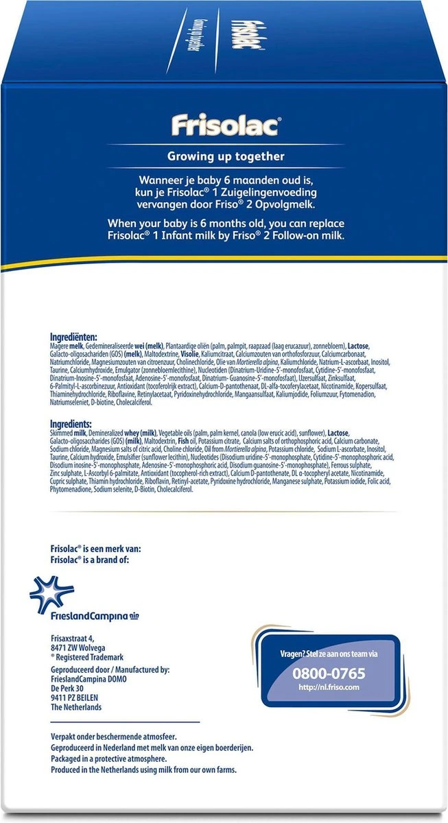Frisolac 1 flesvoeding is een volledige zuigelingenvoeding geschikt voor gebruik vanaf de geboorte van 0 tot 6 maanden. Dit product wordt geproduceerd in Nederland. Frisolac is een merk van FrieslandCampina.