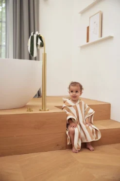 Daarnaast kun je deze poncho goed combineren met de andere items uit de Terry Stripe GOTS collectie. In deze collectie vind je onder andere een washand, badjas en leuke slabben.