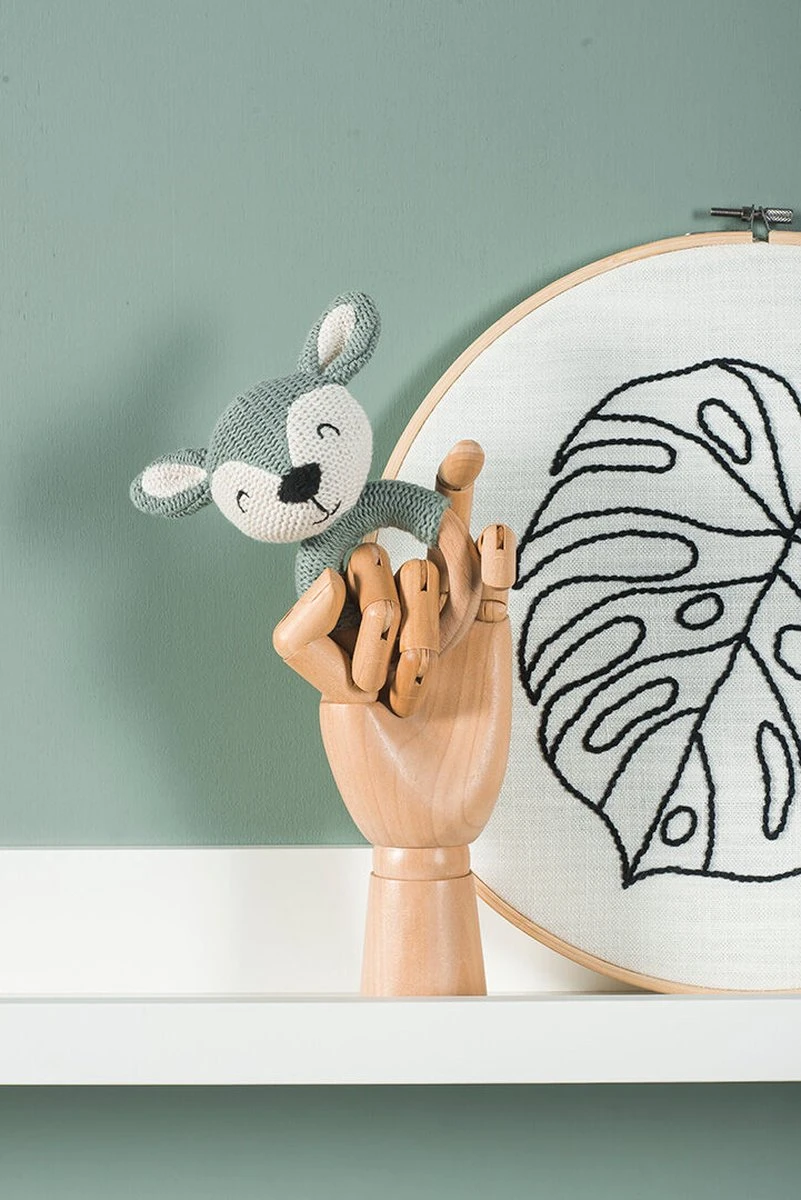 Dit speeltje is een bijtring en rammelaar tegelijk. Het hertje op de houten ring zit goed vast en kijkt je baby elke dag weer even vrolijk en vriendelijk aan. In het hertenkopje zit een belletje waardoor het geluid maakt bij grijpen en aanraken. Door de ring is het speeltje als rammelaar makkelijk vast te grijpen. Natuurlijk worden de oren van het hert lekker nat gesabbeld. Dat kan ook! Het materiaal is 100% veilig. De houten bijtring kan je baby lekker in zijn mond stoppen om er op te sabbelen en te bijten. Dan zal het hertje dankbaar bij zijn neus worden vastgehouden om de ring goed in de mond te kunnen stoppen. Ook dat is helemaal veilig. Doorkomende tandjes kunnen er voor zorgen dat je baby zich minder lekker voelt. Ook niet zo gek natuurlijk: de tand wurmt zich een weg door het tandvlees en dat doet zeer of het geeft jeuk. Vaak zie je het ook wel in het mondje: een harde bobbel en rood of gezwollen tandvlees. Het is hard werken voor jouw baby! Om de pijn iets te verzachten is het voor jouw kleintje fijn om ergens op te bijten. Dat verlicht de druk op het tandvlees bij de doorkomende tandjes. Deze bijtring is veilig voor jouw baby. Dit is een leuk kraamcadeautje. En van dit zelfde lieve hertje zijn er ook speendoekjes en knuffels verkrijgbaar.