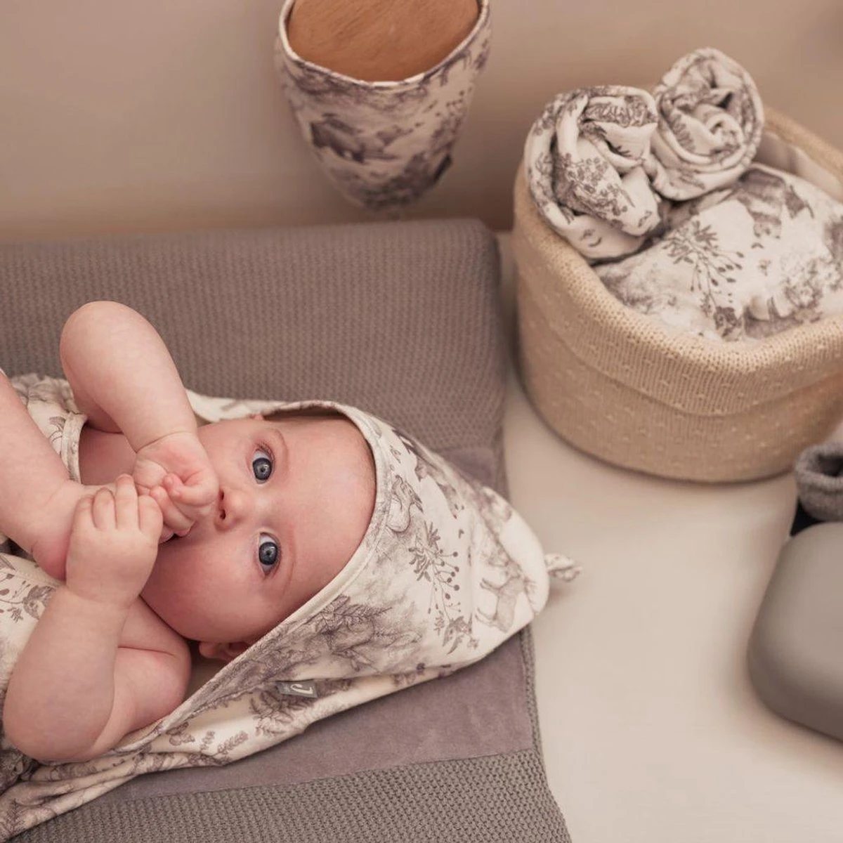 Deze leuke hydrofiele doeken hebben het schattige all over printje van het Pimpelmees x Jollein bosdieren thema. De ondergrond is off white en de print is gedrukt in een warme grijze kleur.