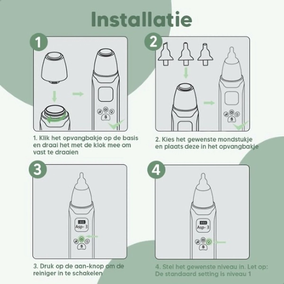 De Neusreiniger heeft 3 flexibele opzetstukken. Zo kun je er in elke hoek makkelijk bij. Eentje is voor baby’s tot 2 jaar, de ander voor kinderen van 2 tot 8 jaar en andere is voor 8 jaar en ouder. Heel makkelijk te gebruiken en voor baby, kind en volwassen.- Let op: Om hygiënische redenen kunnen we gebruikte producten niet retourneren