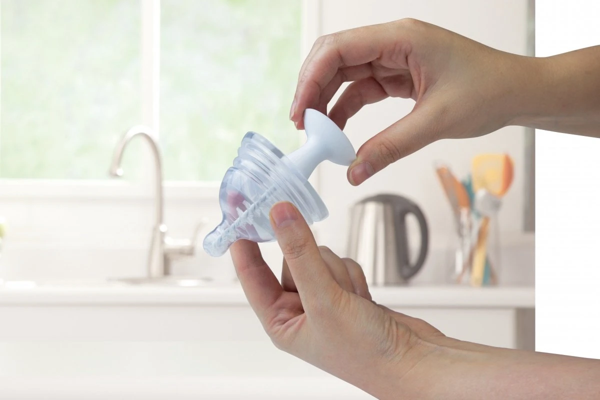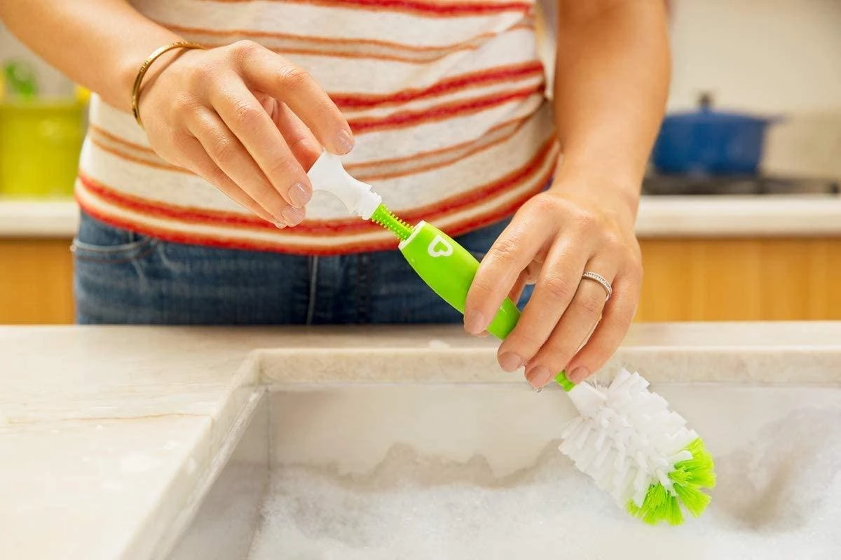 Wie zegt dat flessenborstels gewoon moeten zijn? We veranderden dit volledig met een borstel die rechtop staat en een sterke zuigbasis heeft. Het unieke gestructureerde rubber bereikt moeilijk te reinigen oppervlakken waar ziektekiemen zich graag verstoppen. Binnenin de handgreep zit onze speenborstel, zodat u die ook steeds bij de hand hebt. Gewoon vastzuigen op het werkblad voor reiniging met een hand en drogen zonder kiemen. Hij staat als een huis!