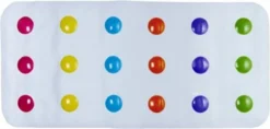 Deze leuke witte badmat met fleurige stippen van Munchkin is een sieraad in elke badkamer. Handig als badzitje voor je kind vanaf 3 jaar, maar natuurlijk geschikt voor elke leeftijd als badmat of douchemat. De gekleurde stippen op de frisse witte mat prikkelen de fantasie en houden de aandacht van kinderen gevangen. De stippen doen denken aan snoepjes of het spelletje twister. Door de vele zuignappen aan de onderkant heeft de badmat stevige grip op de ondergrond. Hij is eenvoudig te reinigen en na afloop los te trekken. Maar waarom zou je, daar staat hij veel te gezellig voor.