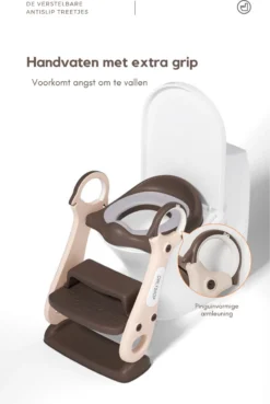 Veiligheid van je kindje staat altijd voorop. De Toilet Trainer heeft twee treetjes en een opstapje op de grond, zodat het makkelijker is om op het toilet te komen en er weer af te stappen. Alle treden zijn extra stevig en voorzien van antislipprofiel, zodat je kindje niet uit kan glijden. Om te helpen bij het opstappen en stevig op de bril te zitten is de Toilet Trainer voorzien van twee handvatten.