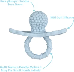 Deze RaZberry bijtspeentjes zijn gemaakt van 100% zachte siliconen en bevat bolletjes op het oppervlak. Deze kalmeren en verzachten het pijnlijke tandvlees van baby tijdens het doorkomen van de tandjes. De bolletjes hebben de perfecte textuur om op te kauwen! Dit bijtspeentje heeft de ideale afmeting voor kleine babyhandjes.