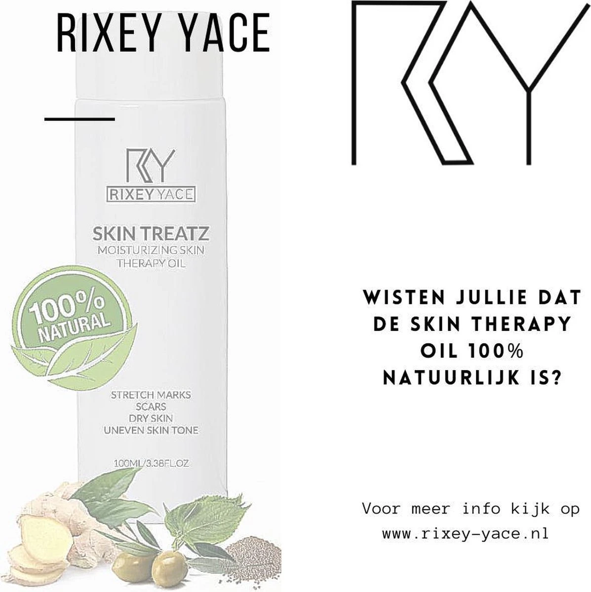 Rixey Yace Skin Therapy Oil bevat uitsluitend natuurlijke ingrediënten en is vrij van chemicaliën. Alle ingrediënten, rijk aan botanische voedingstoffen, zijn bijzonder geschikt voor het hele lichaam, gezicht en haren. De natuurlijke olien ondersteunen het herstellend vermogen van de huid. De olie verminderd littekens, houdt de huid soepel en is hierdoor uitermate geschikt tijden de zwangerschap als zwangerschapsolie / buikolie. Bij vroegtijdig gebruik voorkomt het striae. Dagelijks gebruik zorgt voor een zuivere huid zonder irritaties en draagt bij aan een egale tint.