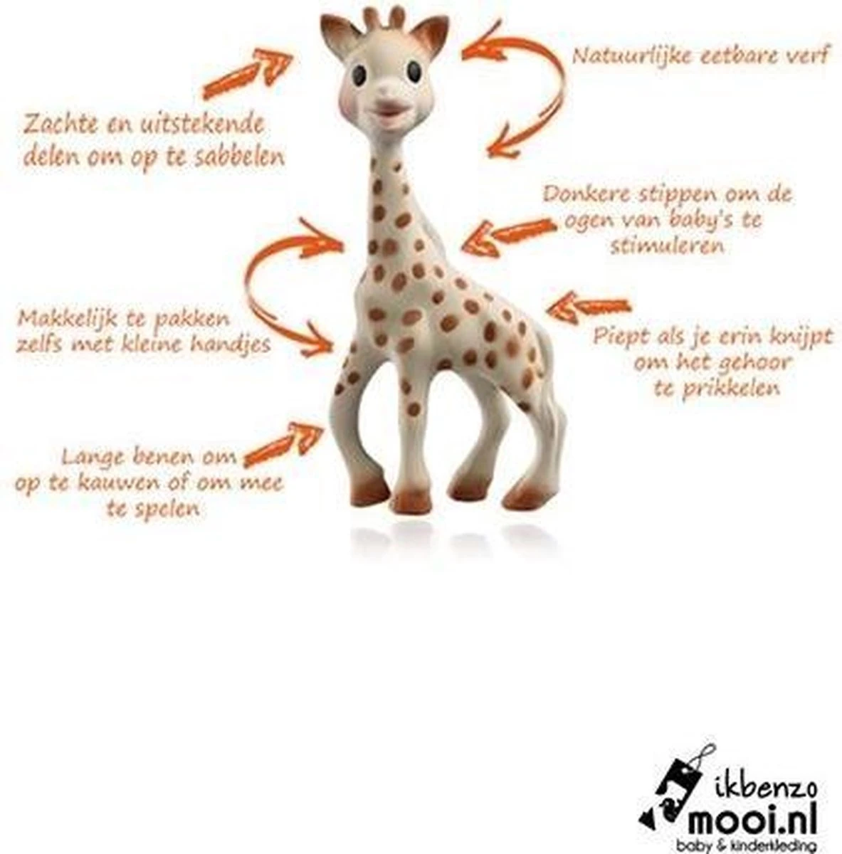 Geboren in Frankrijk in 1961. En al meer dan 60 jaar niets veranderd….. Sophie de giraf is het eerste bijtspeeltje dat de 5 zintuigen van baby stimuleert. Ze is geliefd bij miljoenen baby’s over heel de wereld. Sophie de giraf wordt al generaties lang met de hand geproduceerd in Frankrijk. Ze wordt gemaakt van 100% natuurlijk rubber afkomstig van de Hevea boom en bewerkt met verf die gebruikt wordt in de voedingsmiddelenindustrie. Hierdoor is ze absoluut vrij van schadelijke stoffen zoals PVC, Phthalaten, BPA en andere weekmakers, kortom een veilig en duurzaam speeltje. Het is hierdoor ook niet meer dan logisch dat deze superster al zoveel prestigieuze awards in de wacht heeft gesleept! Sophie is ongeveer 18 cm lang en kan door baby’s met hun kleine handjes makkelijk worden vastgepakt aan haar lange nek of benen. Haar vlekjes en lieve glimlach wekken door het contrast de aandacht van de baby en zorgen ervoor dat de baby haar herkend. Doordat Sophie is gemaakt van natuurrubber heeft ze een bijzondere geur waardoor de baby haar ook makkelijk herkent tussen alle speeltjes. Het subtiele piepje van Sophie stimuleert het gehoor en zorgt ervoor dat de baby kennis maakt met oorzaak-gevolg. En wanneer baby tandjes krijgt, bieden de oortjes en lange poten van Sophie verlichting door erop te sabbelen en te bijten. Sophie is verpakt in een mooie geschenkdoos en is hierdoor ook erg leuk om weg te geven als kraamcadeau. Geschikt voor 0+ maanden Schoonmaakadvies: Sophie kan worden schoongemaakt met een licht vochtig doekje met wat zachte zeep. Wij adviseren Sophie niet onder de kraan te houden of in bad te doen, het piepje van Sophie kan hierdoor onherstelbaar beschadigen. Let op: Sophie niet steriliseren of in de vaatwasser reinigen!